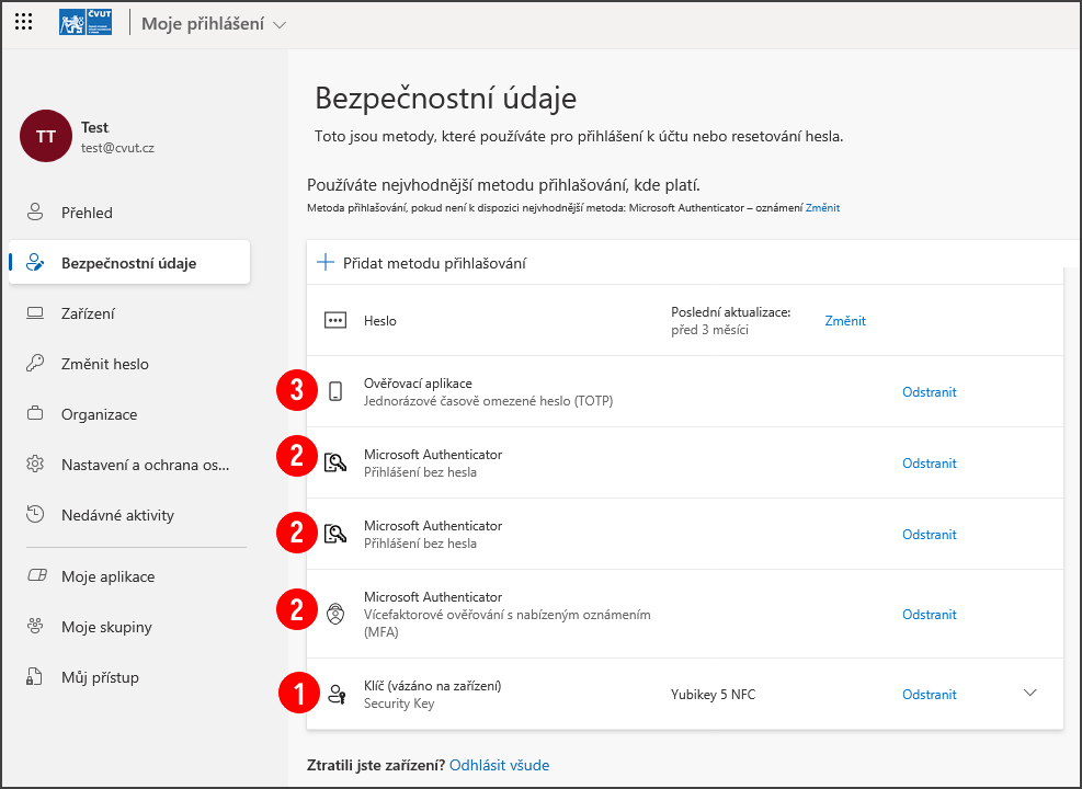 Po přihlášení na stránce Bezpečností údaje pak vidíme přehled nastavených druhých faktorů,